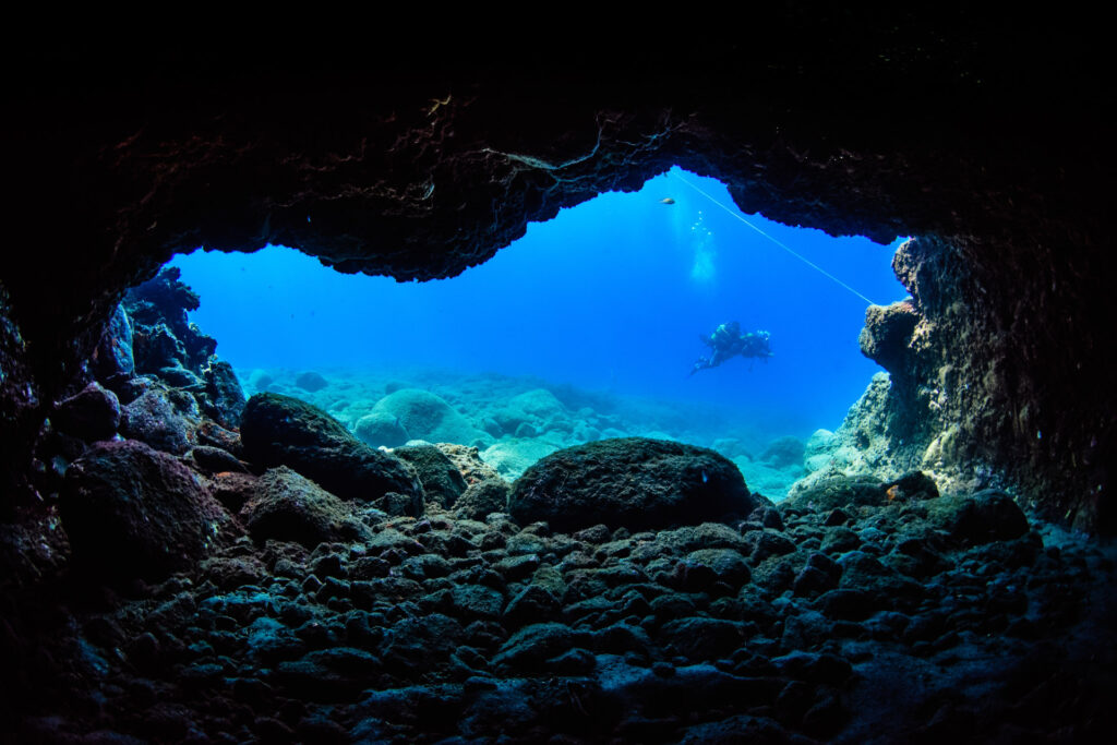 - Fondos y paisajes volcánicos únicos: cuevas, arcos, tubos de lava (túneles volcánicos o tubos volcánicos) y paredes verticales
